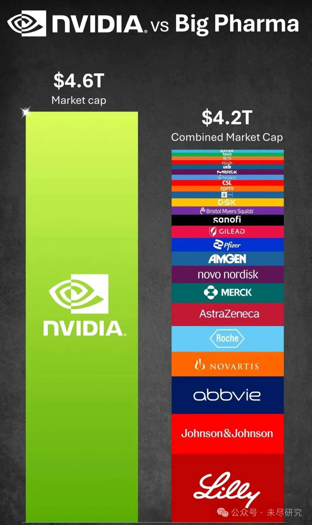 英伟达目前所占的市值,已经达到了 4.6 万亿美元,超过了所有医药巨头市值的总和。