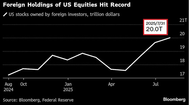 美国资本市场仍然起到了引领技术革命的作用,AI 热潮吸引了全球资本。外国投资者持有的美国股票已增至创纪录的 20 万亿美元,过去几个月增加了 2.5 万亿美元。目前,海外投资者持有约 60 万亿美元美国股市的约 30%,这是自 1945 年以来的最高水平。
