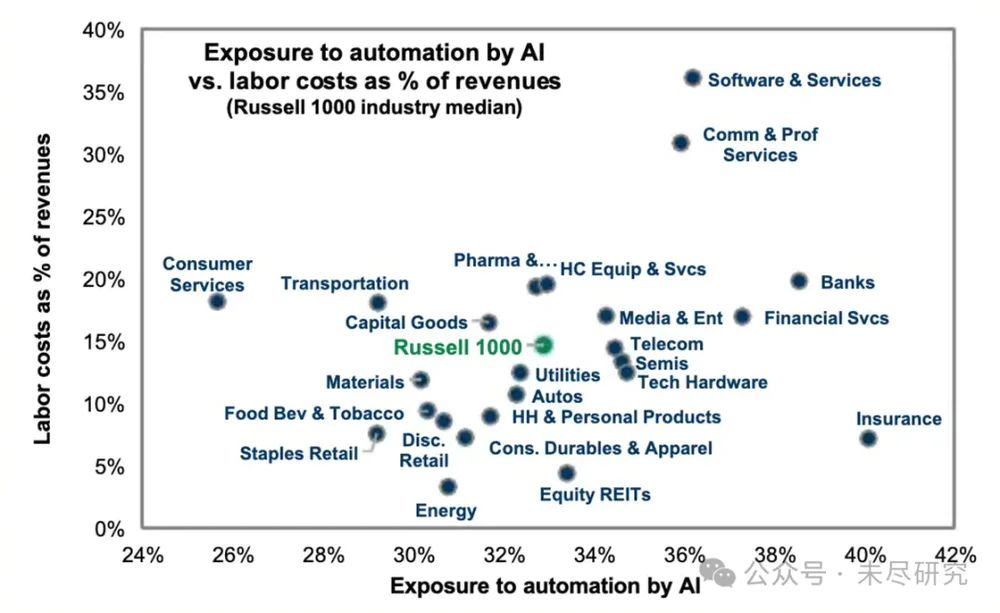 跟踪美国前 1000 家上市公司的 Russell1000 指数成分公司,其中 1/3 已经对 AI 自动化敞口,涉及的人力资源占收入的比重为 15%。其中对 AI 敞口大、人力成本占收入比重较大的行业 (图中绿点右上侧),已经开始加快采纳 AI,如软件服务业、传播及专业服务机构首当其冲,还有银行和金融服务业、媒体娱乐业、医疗服务业及制药行业等。