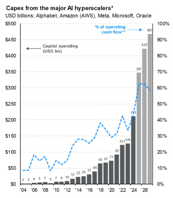JP 摩根估算,从 2025 年到 2027 年,五家超级云计算公司,谷歌、亚马逊 (AWS)、Meta、微软和甲骨文,将在基础设施上投资 1.2 万亿美元,占运营现金流的比重达到 60%。