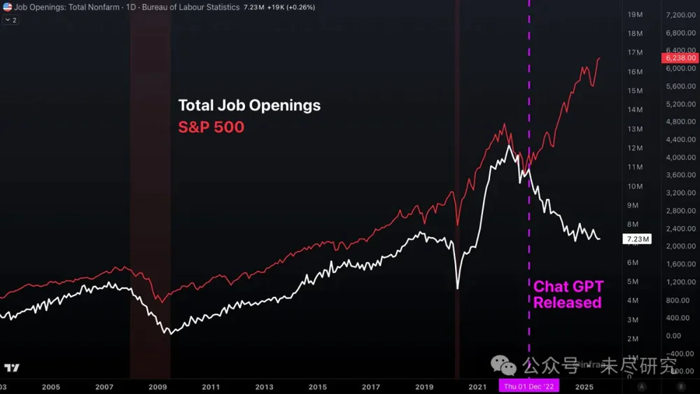 在这一张图上可以明显看出,自从 ChatGPT 发布之后,标普 500 指数一路上扬,但这 500 家美国最大公司招聘的工作岗位却在下降。