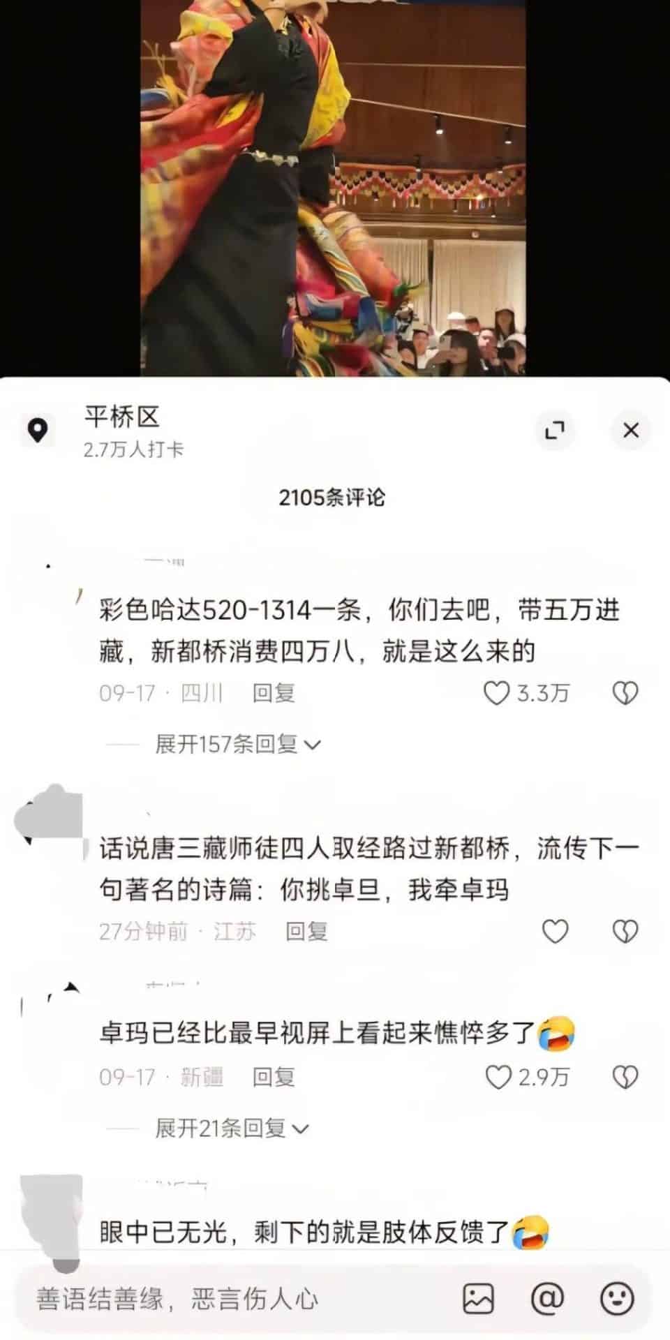 但这些舞蹈单独放在互联网上或许没什么问题,一旦和藏区场景深度绑定,很多人就觉得透着一丝诡异。