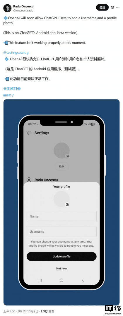 为了支撑该功能,OpenAI 正在同步开发一套完善的配套系统,包括支持用户自定义的 「用户名」 以及可上传头像的个人资料页面。这意味着用户未来将拥有专属的身份标识,并能够像使用其他社交应用一样,搜索并联系平台上的其他用户。