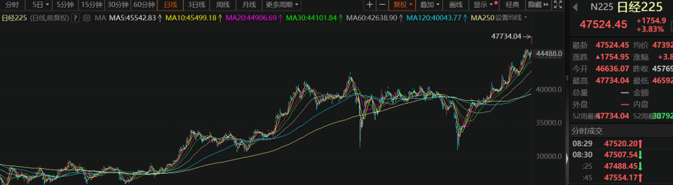 文章来源:黑马财经 黑马财经财经讯 10月6日 日经225指数日内涨超4%,报47601.11点;日本东证指数涨超3%,报3224.27点。日经225指数、日本东证指数均创历史新高。