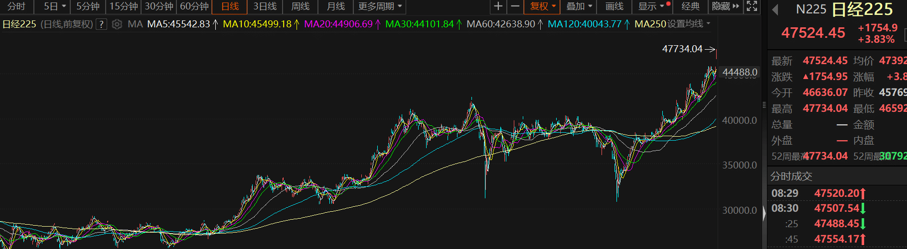 股市风云日经 225 指数日内涨超 4% 首次站上 47000 点 2025 年 10 月 6 日2025 年 10 月 6 日100 文章来源:黑马财经 黑马财经财经讯 10 月 6 日 日经 225 指数日内涨超 4%,报 47601.11 点;日本东证指数涨超 3%,报 3224.27 点。日经 225 指数、日本东证指数均创历史新高。