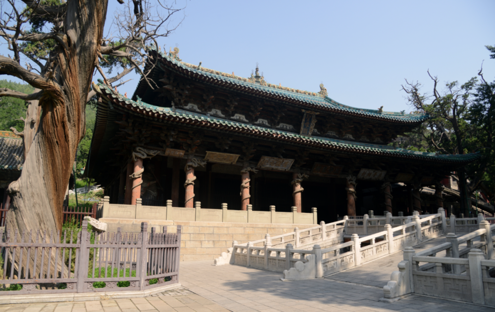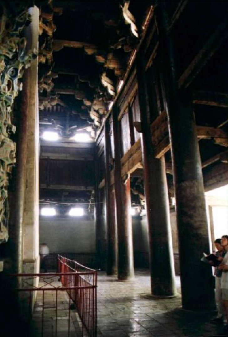 再往前,最精彩的是圣母殿,重檐歇山顶,沿着屋檐下的这一排柱子都是盘龙柱。而且为了让廊子空间非常通透,用两开间的进深当廊子,这在中国古代,尤其是北宋的建筑中也比较少见。