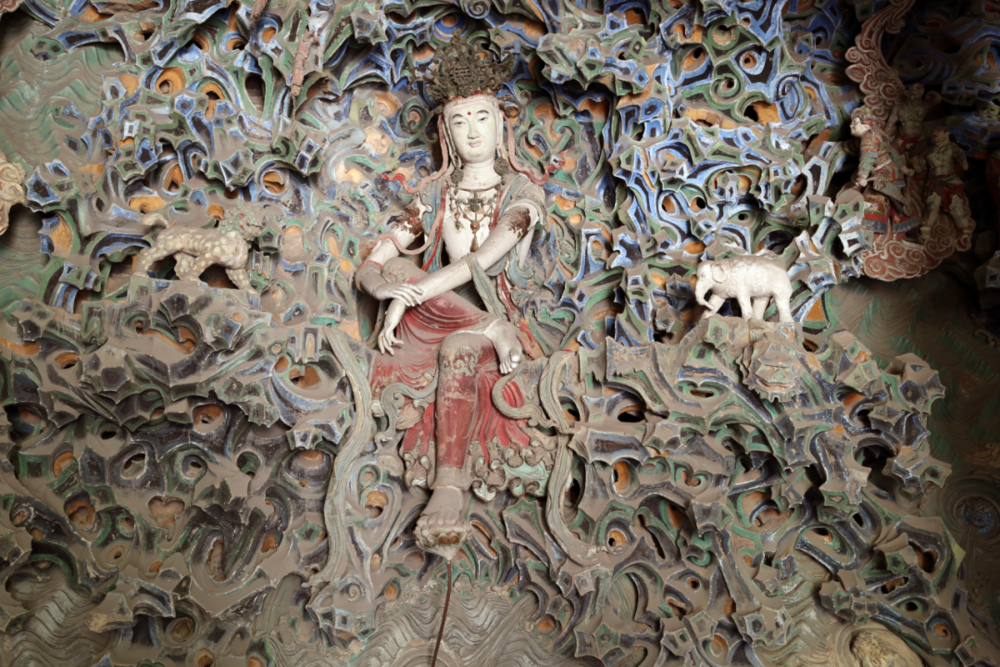 摩尼殿里面有个很有名的塑像,在主尊造像的背面,是这尊观音。在象、狮、虎、豹中间很怡然自得地坐着,游戏坐,二郎腿的造型,俯看芸芸众生。