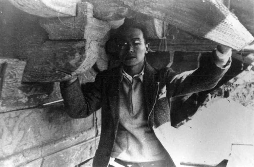 ▲1933 年梁思成于隆兴寺转轮藏殿斗拱下