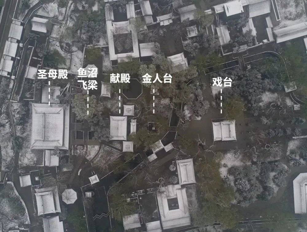 最精彩的是它的中轴线有一个戏台,过来是金人台,然后是献殿、圣母殿,这个轴线上有一系列古老的文物。在献殿和圣母殿之间,有一道飞梁鱼沼,一个飞梁架在水池上。