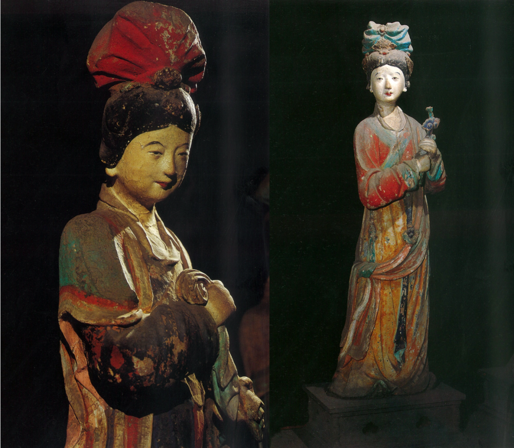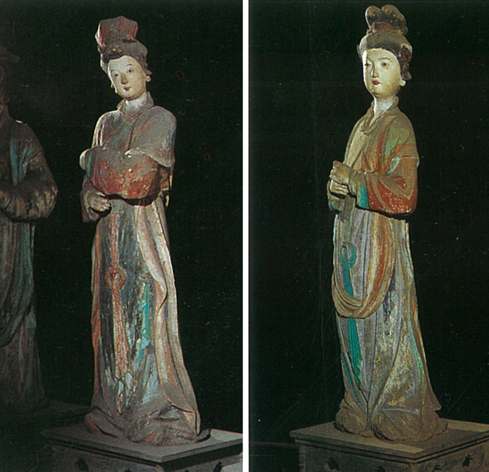 里面的塑像也一样体现了宋的审美好尚。我们前面讲的好多中国古建筑都是佛教建筑,佛教建筑里的塑像当然很精彩,但难免程式化。像晋祠的这一组仕女完全像有模特一样,用古代艺术史的术语讲,有点像古典主义和现实主义的差别。