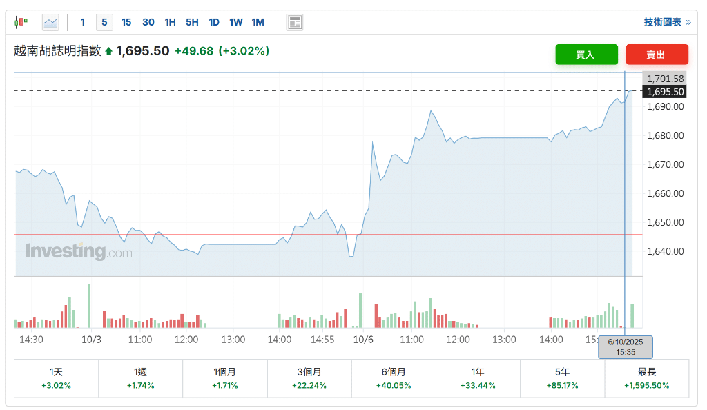 制造业的强劲表现是此次经济扩张的核心驱动力。国家统计局负责人 Nguyen Thi Huong 在发布会上表示,由于企业在美国关税最后期限前加紧生产,制造业活动持续增长。数据公布后,越南基准的 VN 指数周一上午一度上涨 2.6%,创下自 8 月 26 日以来的最大单日涨幅。