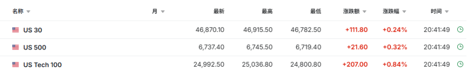 截至发稿,道琼斯指数期货涨 0.24%,标普 500 指数期货涨 0.32%,纳斯达克 100 指数期货涨 0.84%。