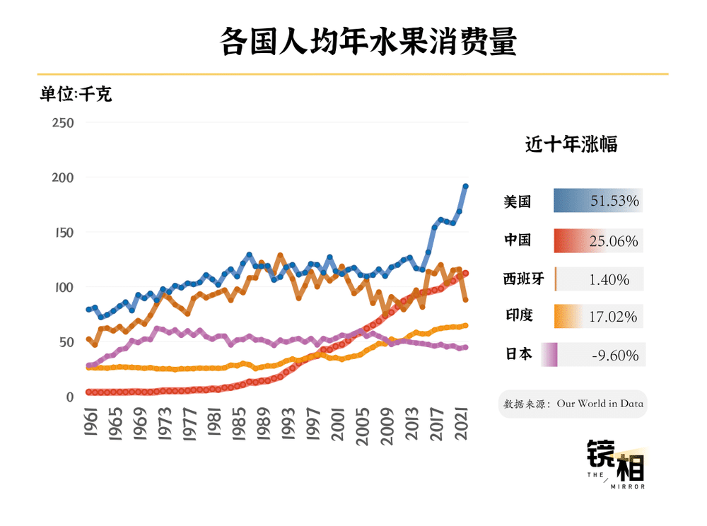 但现在不同了,如今中国人平均每天能消费 300 克左右的水果,虽然刚刚满足要求,但相比 60 年前,已是极致的飞跃,是同为人口大国的印度的两倍,赶上了欧洲水果生产大国西班牙,同时邻国日本则还处于 60 年前的水平。
