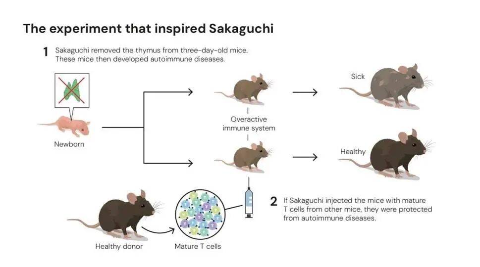 与主流相反,日本名古屋爱知癌症中心研究所 (Aichi Cancer Center Research Institute in Nagoya,Japan)的坂口志文并未放弃。他受到一项早先被认为具有矛盾实验的启发:研究者切除新生小鼠的胸腺,以了解胸腺在 T 细胞发育中的作用。他们本以为小鼠会缺少 T 细胞、免疫反应减弱。但如果在出生后第 3 天进行切除,免疫系统却会失控,小鼠继而出现多种自身免疫疾病。