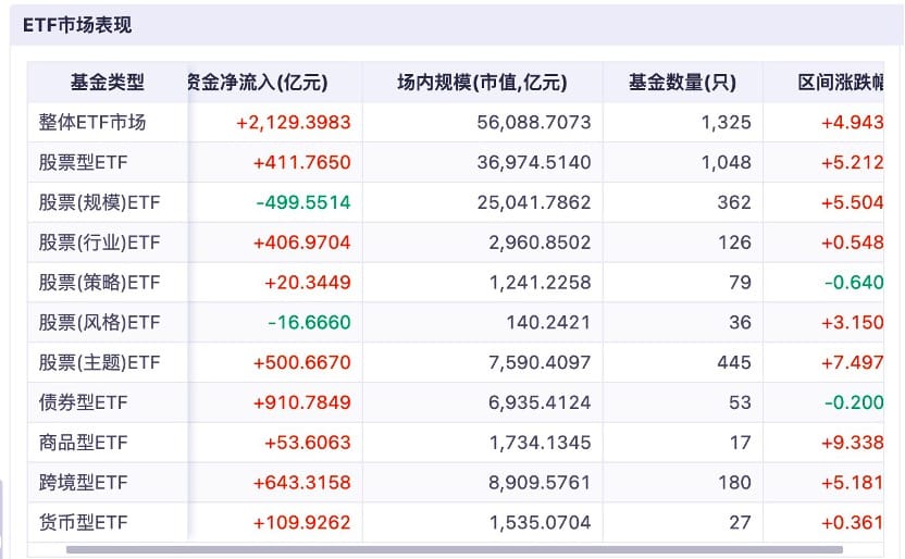 9 月最后一个交易日,股债双牛,完美收官。整体 ETF 市场 9 月资金净流入 2129.4 亿元,场内 ETF 规模超 5.6 万亿元。资金在 9 月爱买什么?债券 ETF、跨境 ETF、股票 ETF 以及货币 ETF 均有不同程度净流入。
