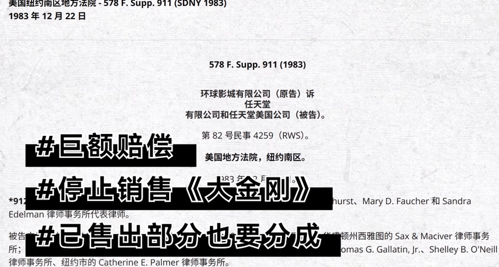 1983 年,环球影业将任天堂告上法庭,除了巨额赔偿外,还要求任天堂停止销售 《大金刚》,已售出部分它也要分成。