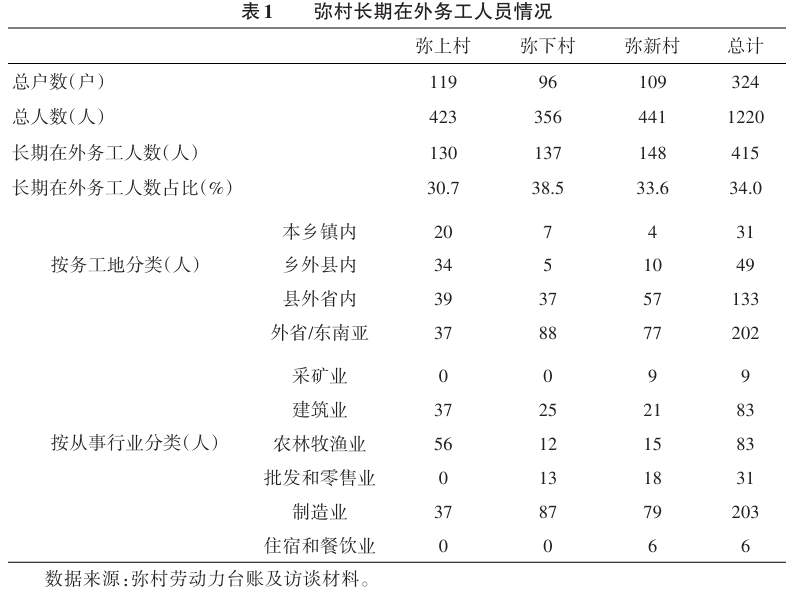 弥村下辖三个自然村:弥上村、弥下村和弥新村。从当前的情况来看,三个自然村的村民家庭收入来源基本都以长期外出务工为主,在村内打零工或务农为辅。弥村共有户籍人口 1220 人,超过 30% 的劳动力长期在外务工,是典型的 「空心村」。具体数据如表 1 所示。