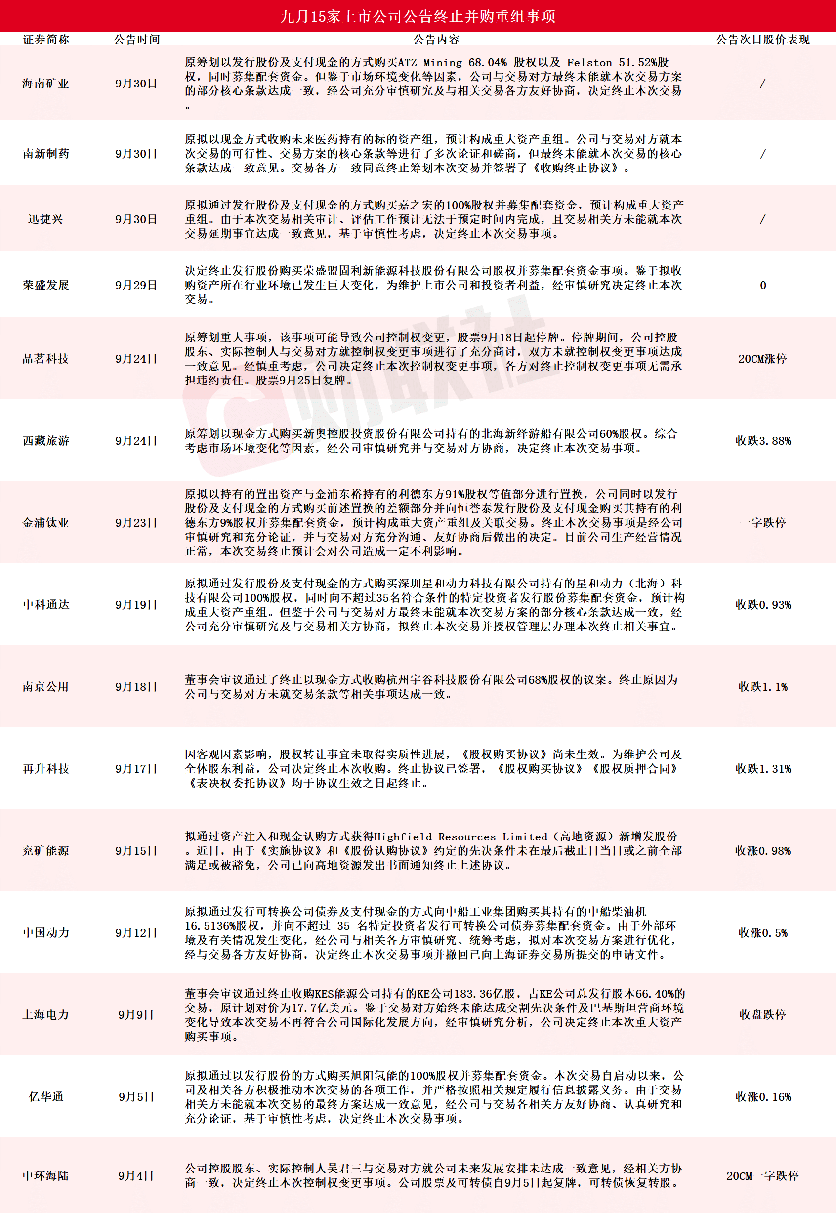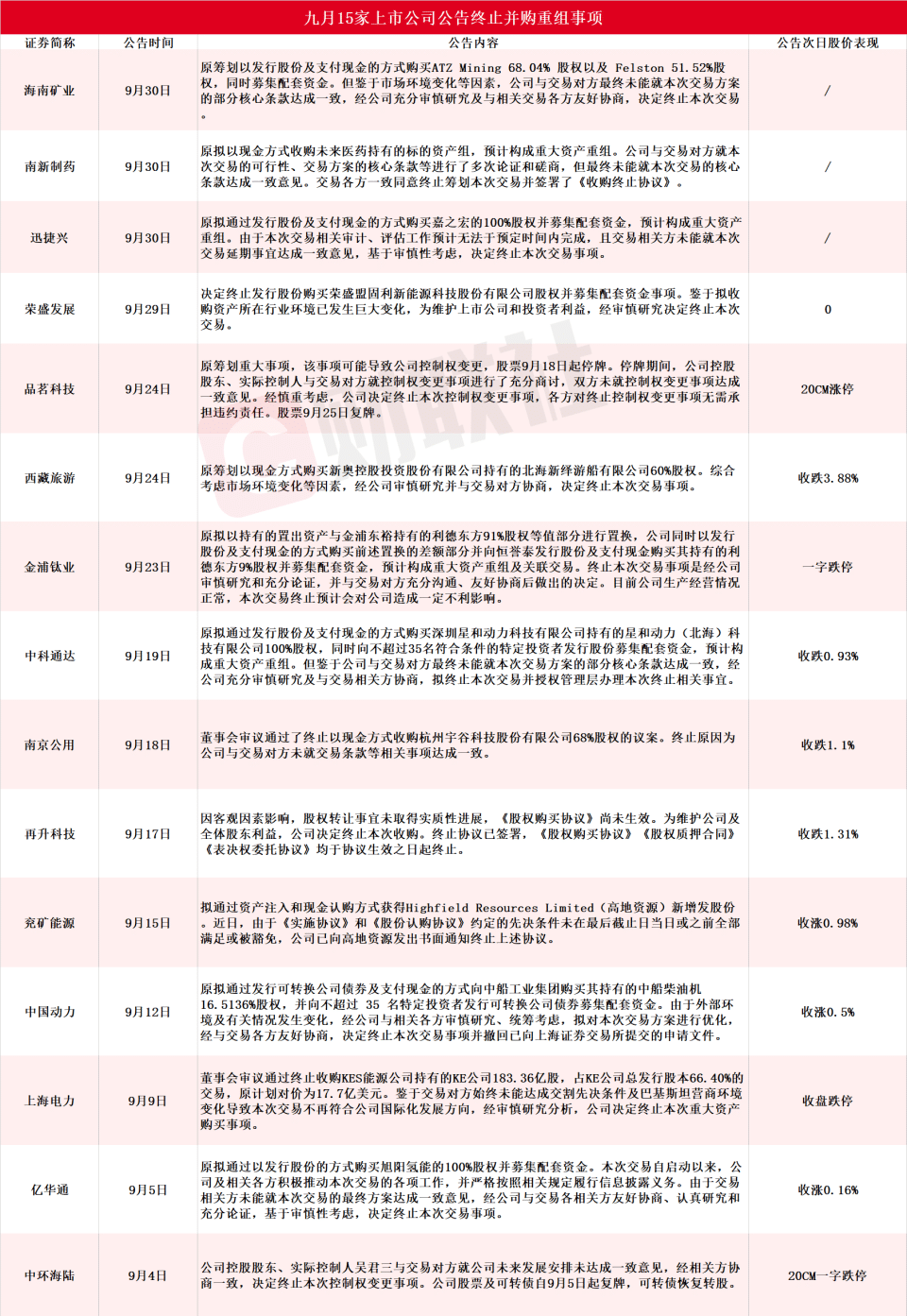财联社 10 月 8 日讯 (编辑 若宇)据财联社不完全统计,九月包括海南矿业、南新制药、迅捷兴、荣盛发展、品茗科技、西藏旅游、金浦钛业、中科通达、南京公用、再升科技、兖矿能源、中国动力、上海电力、亿华通、中环海陆在内的 15 家 A 股上市公司公告终止并购重组事项,详细情况见下图: