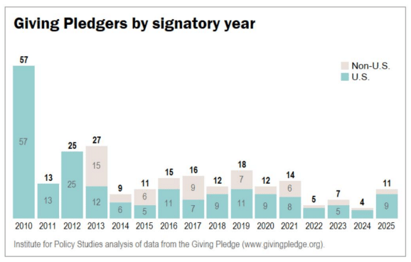 这一誓言由比尔·盖茨、梅琳达·弗朗奇·盖茨与沃伦·巴菲特于 2010 年发起,旨在推动全球超高净值人群投入更多慈善事业。截至目前,全球已有 256 位亿万富翁签署,但签署率在美国也仅为 13%,且缺乏监管机制。更重要的是,大多数承诺者并未真正捐出一半资产,捐赠资金多流入私人基金会和捐赠者建议基金 (DAFs)。简而言之,多数人 「说得多、捐得少」。