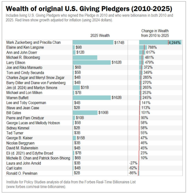 约翰·杜尔夫妇:虽通过基金会累计捐出 5.83 亿美元,但主要来自早期股票升值。2001–2016 年仅捐入 3400 万美元,之后无新增。目前净资产为 120 亿美元,签署誓言后仅捐出约 0.3%,但财富增长了 617%。
