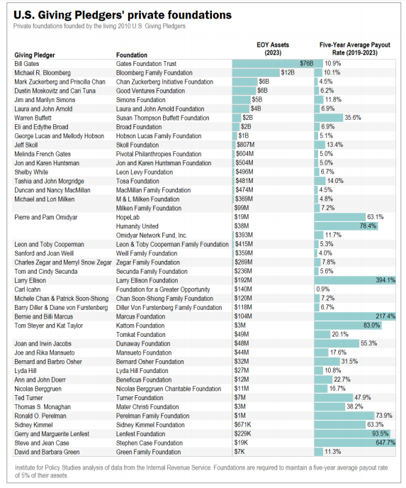 2024 年,「捐赠誓言」 签署者共捐出或承诺捐赠 93 亿美元,其中 57% 流向基金会或 DAFs。据估算,最初的签署者累计捐出约 2060 亿美元,其中 80% 进入了自设基金会。截至 2023 年,这些基金会共持有约 1200 亿美元资产。
