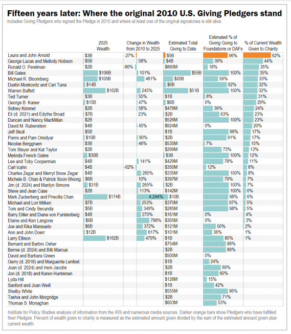 目前仍有 32 位在世签署者仍是亿万富翁,他们平均捐出了自身可支配财富的 17.8%。其中,劳拉与约翰·阿诺德夫妇 (后者曾创立了对冲基金 Centaurus Advisors)是唯一兑现 「捐赠一半」 承诺的成员,捐出 47.6 亿美元,现净资产为 29.3 亿美元。