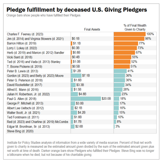 22 位已故签署者去世时总资产约为 434 亿美元,他们平均捐出了 43% 的财富。