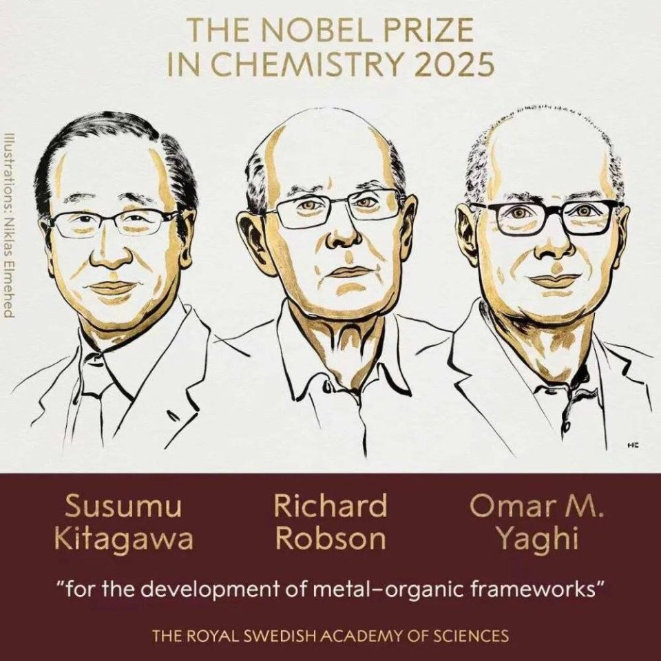 当地时间 10 月 8 日 11 时 45 分,2025 年诺贝尔化学奖公布,授予北川进 (Susumu Kitagawa)、理查德·罗布森 (Richard Robson)和奥马尔·亚吉 (Omar Yaghi),以表彰 「他们对金属-有机框架的发展」。
