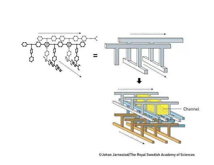 三位获奖者发展出一种全新的分子结构架构形式。在他们的设计中,金属离子充当 「角石」,由长链有机 (以碳为基础的)分子相互连接。金属离子与有机分子共同组装成具有大量空腔的晶体结构。这种多孔材料被称为金属有机框架 (MOF)。通过改变 MOF 所采用的构筑单元,化学家可以定向设计出能够捕获和储存特定物质的材料。MOF 还可以驱动化学反应或导电。