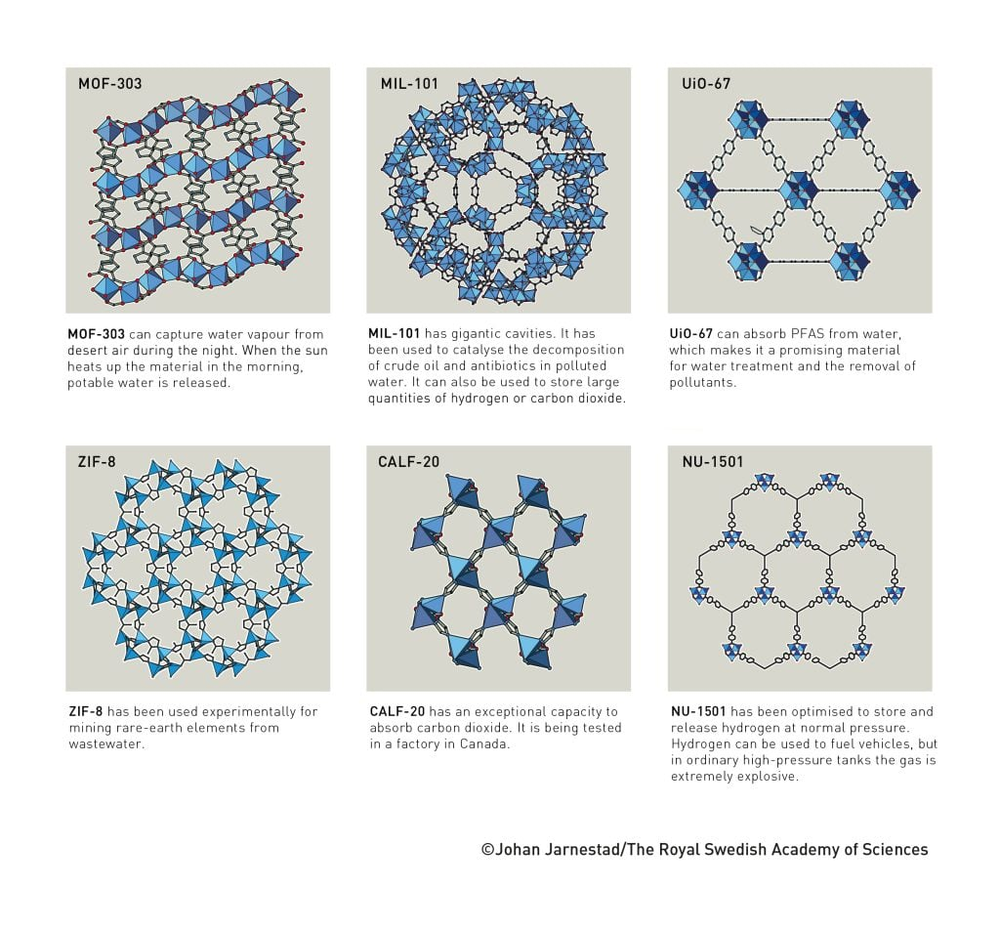 三位获奖者创造了一种具有巨大空间的分子结构,使气体和其他化学物质能够在其中流动。这些结构被称为金属有机框架 (metal-organic frameworks,简称 MOF),可用于从沙漠空气中提取水分、捕获二氧化碳、储存有毒气体,或催化化学反应。
