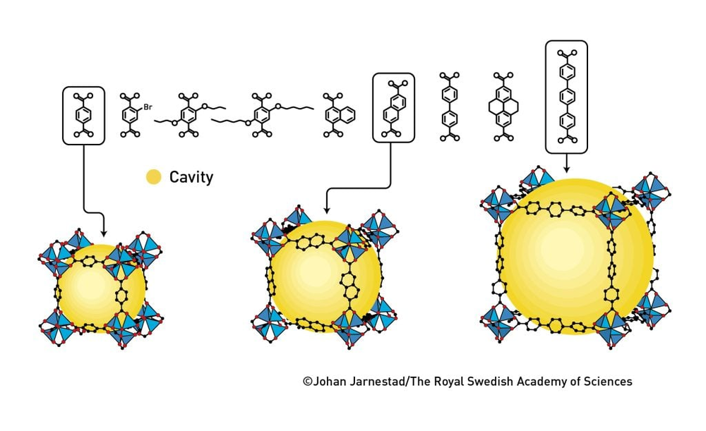 图 6. 二十一世纪初,奥马尔·亚吉证实可构建系列化 MOF 材料。通过调控分子连接体,成功获得具备不同性质的材料,包括 16 种具有不同孔径的 MOF-5 变体。©Johan Jarnestad/瑞典皇家科学院