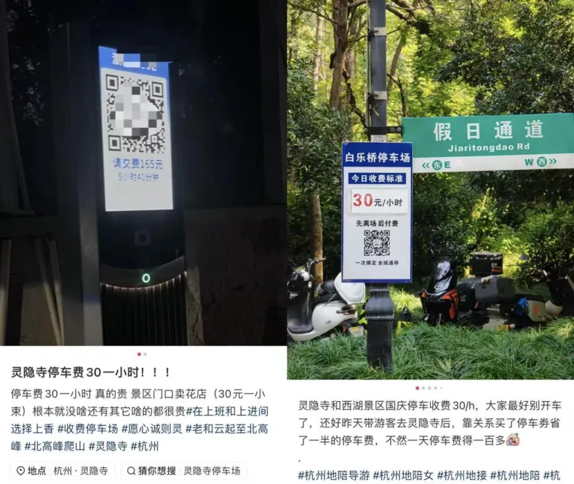 假日期间,多地景区停车场收费标准遭遇吐槽。以杭州灵隐寺为例,每小时收费 30 元,游玩半日停车费轻松突破百元。