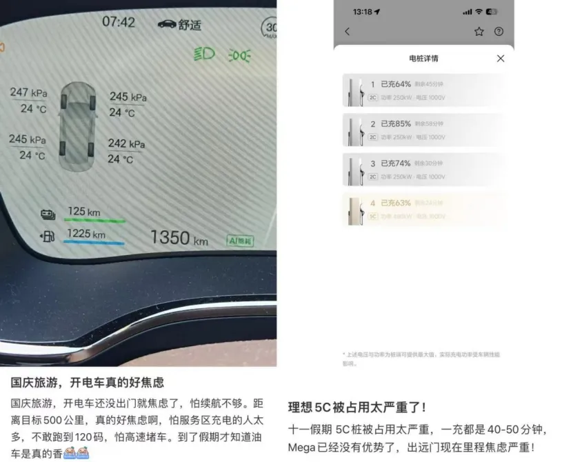 雪上加霜的是,高速巡航场景本身就更耗电,导致标称续航大打折扣,进一步加剧了车主的 「电量焦虑」。规划好的充电点一桩难求,下一个服务区又远在天边,这种 「前不着村后不着店」 的恐慌,让所有科技舒适感都荡然无存。