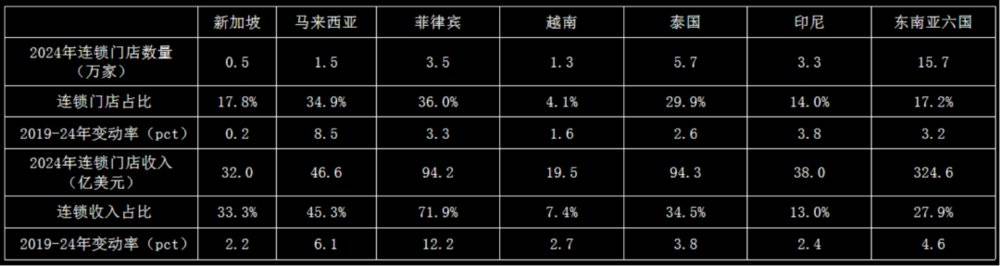 但从供给端角度看,东南亚的餐饮连锁化程度偏低。按门店收入计算,东南亚六国的连锁化率只有 27.9%,低于全球 35.2% 的水平,相较日韩约 50% 左右、美国近 60% 的水平仍有较大差距。