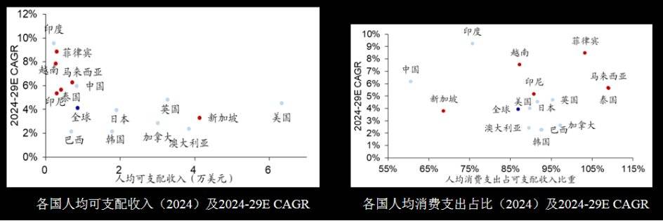 在消费支出方面,东南亚人的大部分收入都会用于消费,基本都是 「月光族」,GDP 中 60% 来自消费。根据 Euromonitor 数据,东南亚整体消费意愿较高,东南亚六国人均消费支出占可支配收入比重,除新加坡外均超过世界平均水平。