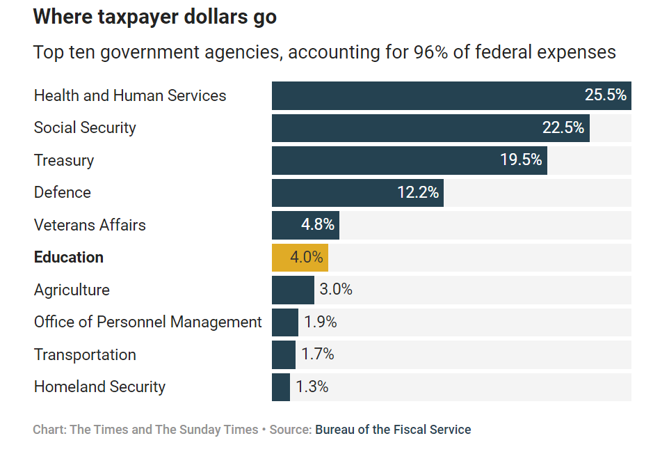 教育经费美国联邦支出的 4.0%,在前十个政府机构中排名第六,不算靠后