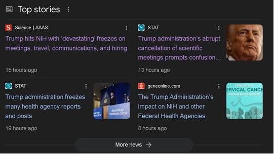 根据 《华盛顿邮报》 和 《美联社》 报道,特朗普政府命令 NIH 在 2 月 1 日前停止发布所有通讯,并取消演讲和出差等活动,任何例外需获得总统任命的人员批准。除了暂停通讯外,还包括叫停会议、冻结招聘等措施。虽然新政府上任时曾短暂暂停通讯,但此次暂停时间长达数周,前所未有。这种不确定性将对科学界,尤其是早期研究人员,造成严重影响。