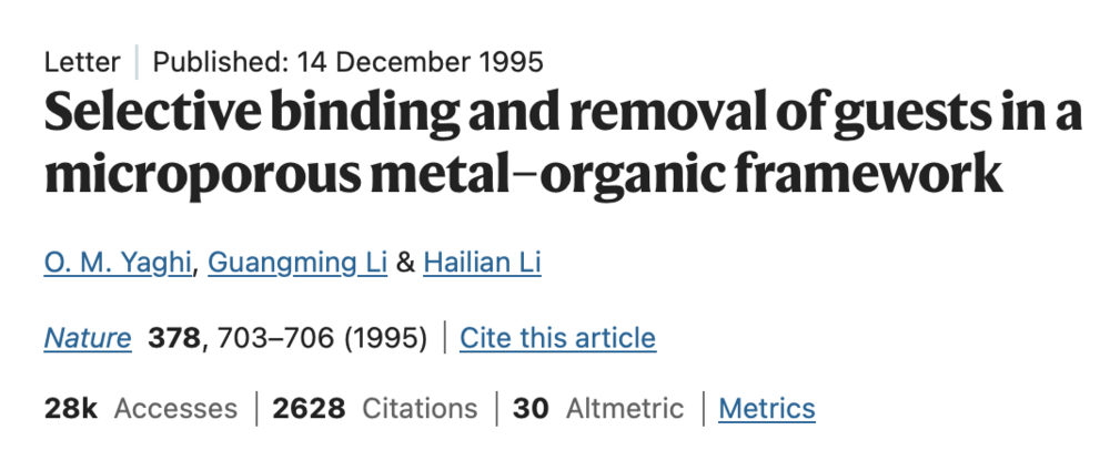 1995 年,亚吉发表那篇关于金属有机框架的里程碑式的论文,文章署名除了亚吉,另外两位都是中国名字。