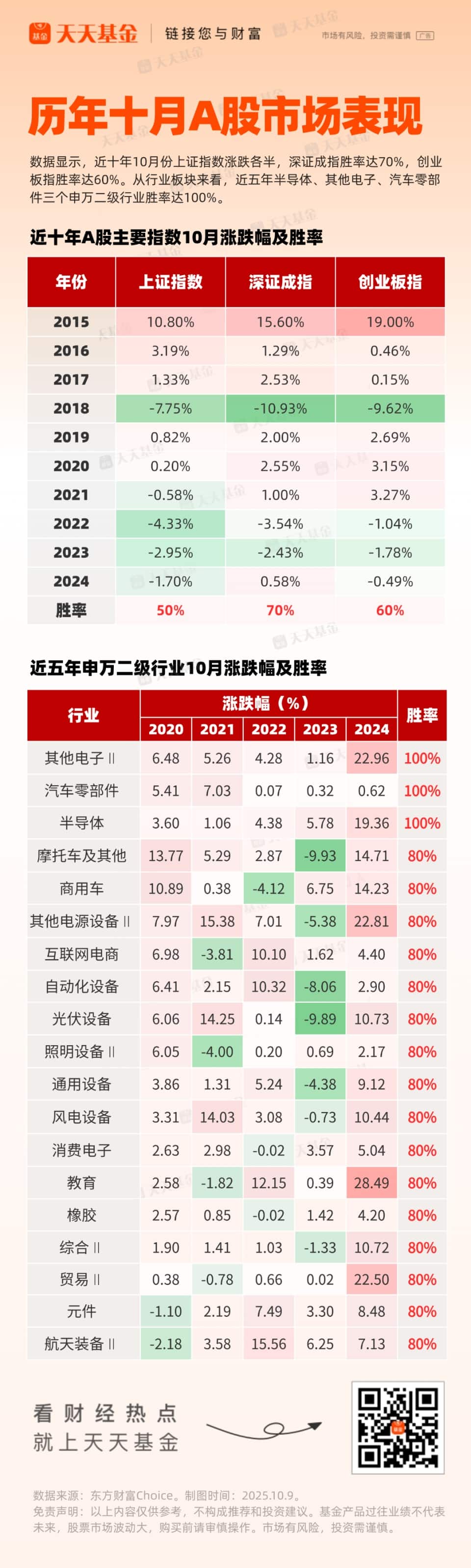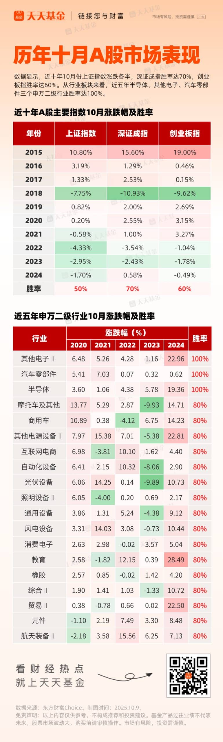 据东方财富Choice 数据,2015 - 2024 年 10 年间,十月份上证指数涨跌各半,近三年偏向弱势;深证成指胜率达 70%,除 2018、2022、2023 这三年偏熊的年份,其他均上涨;创业板指胜率达 60%。