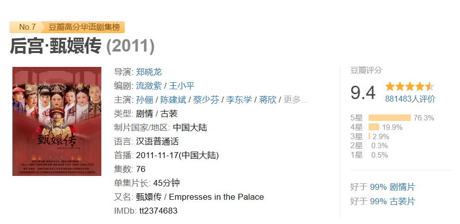 《甄嬛传》 这部剧在豆瓣的评分高达 9.4。(图/豆瓣)