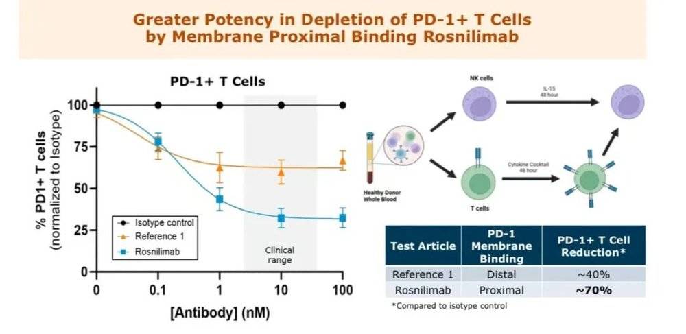 Rosnilimab 药物的核心优势在于靶向性更强、耗竭致病性 T 细胞效应能力更优。它能够特异性结合 PD-1 的膜近端表位,相比其他 PD-1 激动剂 (如礼来 Peresolimab、强生 JNJ-67484703),可在外周血中消耗超过 90% 的致病性 T 细胞,而后者仅能消耗约 60%。