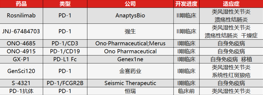 正如上文提到的金赛药业,目前已启动 PD-1 激动剂 (注射用 GenSci120)在 RA、系统性红斑狼疮 (SLE)两个适应症的 1 期临床试验,同时还计划在美国开展 RA 适应症的临床研究。