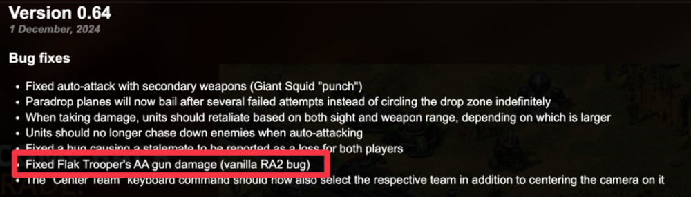 比如 0.64 版本,修复防空步兵对防空炮的伤害 (原版 《红警 2》bug)。