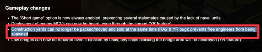 0.18 版本,建筑工厂不再能够同时被打包/移动和出售 (红戒 2 及尤里复仇 bug);防止免费工程师被刷出。
