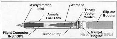 「快鹰」 技术展示阶段的总体布局,前部为燃料舱和战斗部,通过万向头铰接的后部助推器/冲压发动机燃烧室实现 「推力矢量控制」