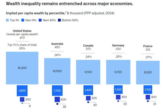 但这一数字与实际经济表现的脱节日益加剧——从 25 年前的全球 GDP 的 4.7 倍扩大至了如今的 5.4 倍。财富集中度也仍令人震惊:前 1% 的富翁群体拥有全球五分之一的财富。