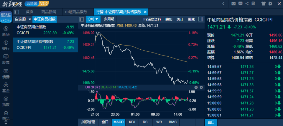 图为中证商品期货价格指数日内走势图 (来源:新华财经专业终端)