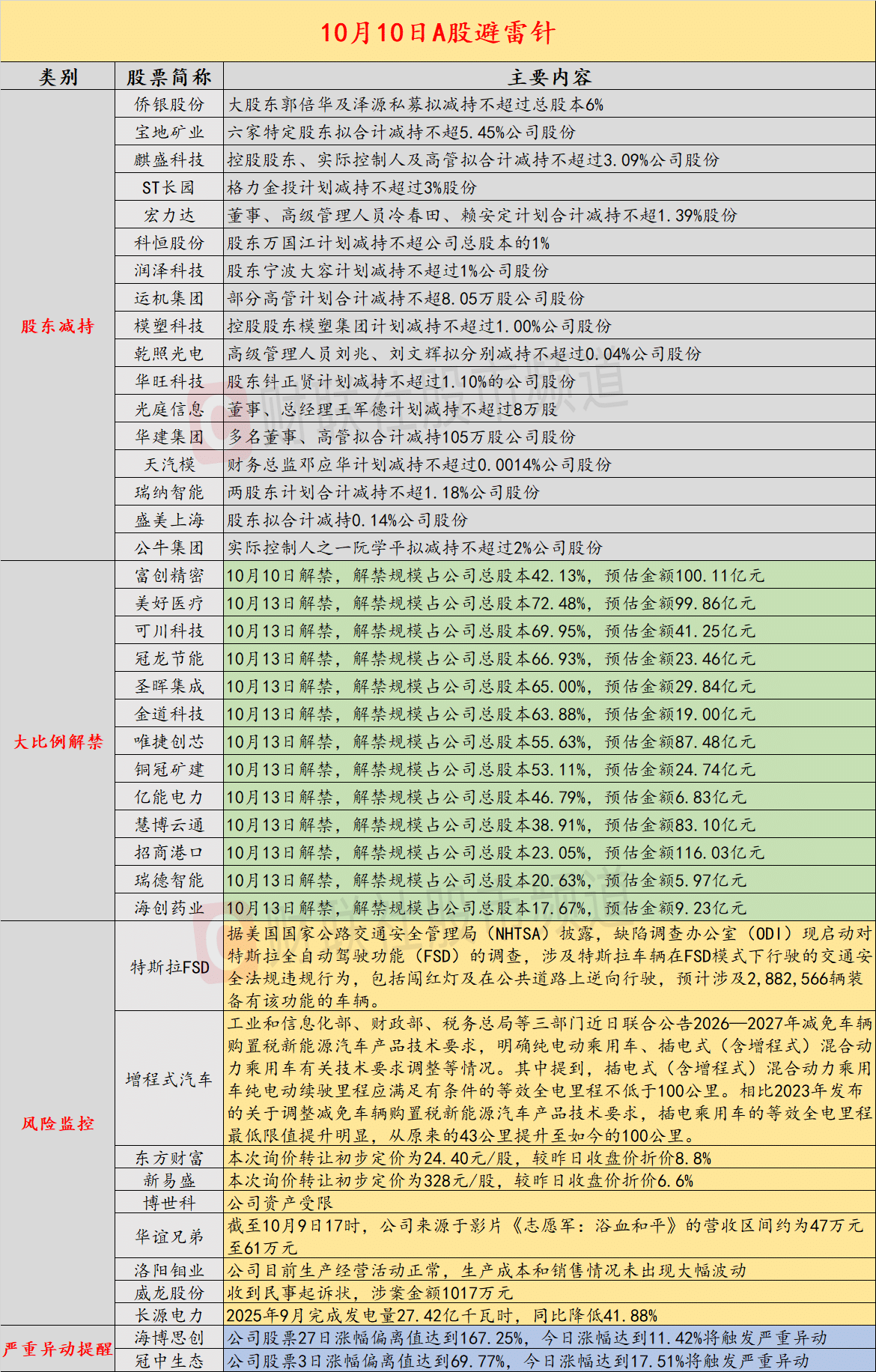 导读:财联社 10 月 10 日投资避雷针,近日,A 股及海外市场潜在风险事件如下。国内经济信息方面包括:1) 中芯国际、佰维存储两融折算率均调为零;2) 工信部等三部门调整 2026—2027 年减免车辆购置税新能源汽车产品技术要求;公司方面重点关注包括:1) 东方财富本次询价转让初步定价为 24.40 元/股,较昨日收盘价折价 8.8%;2) 新易盛本次询价转让初步定价为 328 元/股,较昨日收盘价折价 6.6%;海外市场重点关注包括:1) 美股三大指数集体收跌,热门科技股普涨跌不一;2)COMEX 黄金期货收跌 1.95%,COMEX 白银期货收跌 2.73%。