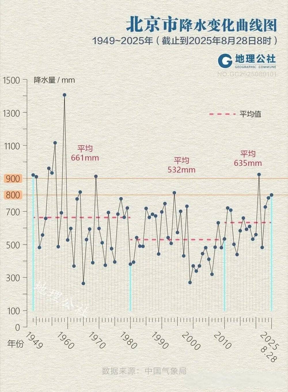 这种变化最直接的表现是华北雨季的显著延长,例如 2022 年雨季长达 53 天,较常年平均值大幅增加。与此同时,北方地区的降水强度也明显增强,北京等地的年降水量更是几乎每年都会创下新的纪录。