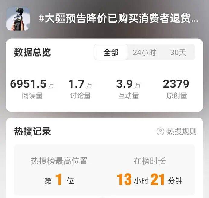社交媒体上,「大冤种」 的自嘲与维权声浪迅速将大疆推上热搜,线上线下渠道的售后标准差异更引发热议。